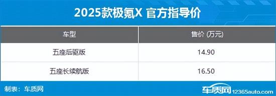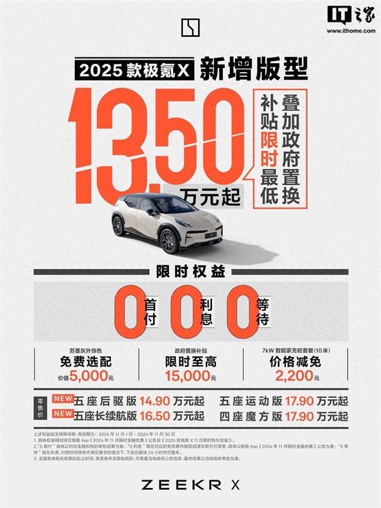11月1日,极氪汽车官方宣布旗下2025款极氪X新增车型正式上市,本次共推出2款车型,分别是五座后驱版和五座长续航版,售价为14.90万元和16.50万元,叠加政府置换补贴限时最低售价为13.50万元起。