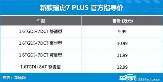 动力系统方面,新款瑞虎7 PLUS搭载1.6T发动机,其最大功率为145kW,最大扭矩为290N·m,传动方面匹配的是7DCT和8AT变速箱。