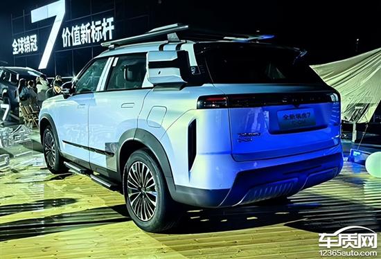 侧面的线条平直硬朗,当下流行的隐藏式门把手设计也没有缺席,上扬式腰线以及微微隆起的轮眉塑造出十足的肌肉感。尾部配备贯穿式LED尾灯,高度与两侧腰线齐平,提升了尾部的视觉重心。后包围处大面积的黑色防擦护板则增加了整车的越野气质。