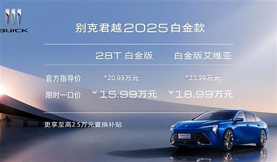10月30日,2025款别克君越正式上市,共推出2款车型,售价区间为20.99-23.99万,限时价15.99-18.99万,最高可获得2.5万元置换补贴。新款车型在配置上进行小幅调整,并搭载第八代Ecotec 2.0T可变缸涡轮增压发动机,配备9AT变速箱。