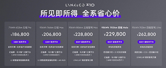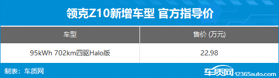 12月2日,领克Z10 95kWh 702km四驱Halo版车型正式上市,售价为22.98万。新款配置介于95kWh 806km后驱智驾Max和95kWh 702km四驱智驾Ultra版本之间,属于高配车型。与此同时,领克官方还针对领克Z10推出了全系省心价,售价区间为18.68-26.28万元。