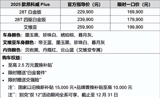 12月10日,2025款别克昂科威Plus正式上市,新车推出3款车型,售价区间为22.99-25.99万元,与此同时官方还推出了限时一口价,价格区间为16.99-19.99万元。此外,购该车享至高2.5万元置换补贴、赠送“白金套件”限时礼遇,更享“双12”限时赠送交强险。