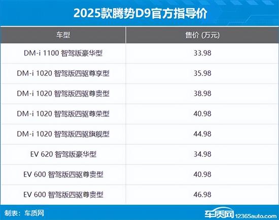 12月26日,2025款腾势D9正式上市,新车共推出8款配置车型,售价区间为33.98-46.98万元。同时,腾势还发布了置换权益、定金膨胀等多项购车权益。此外,作为年代改款车型,其主要针对配置进行升级,并全系标配“天神之眼”高阶智能驾驶辅助系统等。