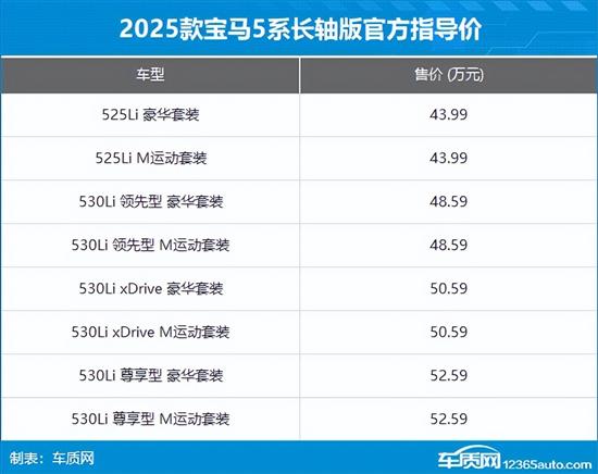 12月27日,车质网从官方获悉,2025款宝马5系长轴距版正式上市,此次共推出8款车型,售价区间为43.99-52.59万元。作为改款车型,新车与老款车型售价一致,并针对配置进行了调整。