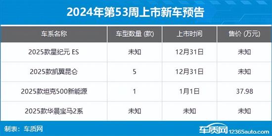 2024年第53周(12月30日-2025年1月5日)上市新车预告