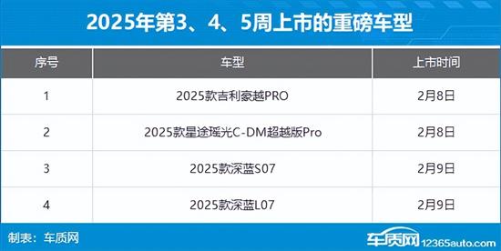 2025年第3、4、5周(1.20-2.9)上市新车汇总
