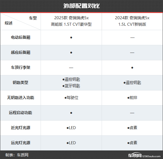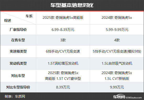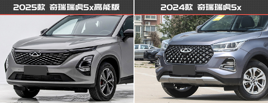 2025款奇瑞瑞虎5x高能版(以下简称:瑞虎5x高能版)共推出3款车型,售价区间6.99-8.39万元。与老款车型相比,起售价有所提升,顶配车型售价降低不少。为了直观对比,我们选取2025款奇瑞瑞虎5x高能版1.5T CVT豪华型和2024款奇瑞瑞虎5x 1.5L CVT新锐版进行比较,以便更加直观地看出新老款车型的具体变化。(由于目前图片数量较少,因此老款车型的图片有些并不是相对应的具体款型)