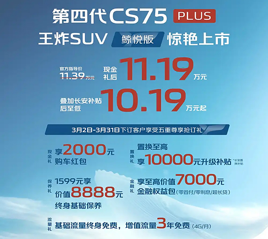 3月2日,第四代长安CS75PLUS鲸悦版正式上市,新车共推出1款车型,官方售价为11.39万元,现金礼后11.19万元(限时3月31日前),现金礼叠加补贴后售价10.19万元。同时,官方还推出置换礼、保养礼等五大购车权益。