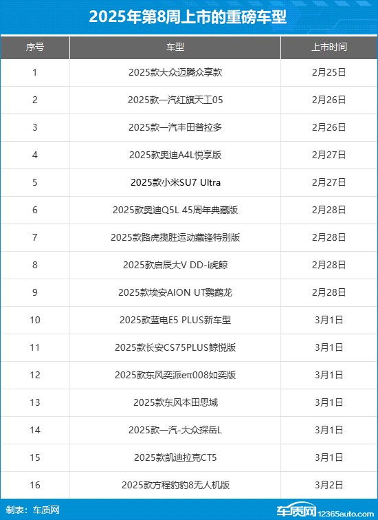 回顾上周国内车市,有不少重磅车型迎来上市。红旗推出了全新纯电动中型车——天工05,新车基本保留了红旗E009概念车的主要设计元素,续航最高达到750km;小米SU7 Ultra于上周正式上市,作为小米SU7的性能版车型,最大可输出1548匹马力;埃安推出了全新AION UT鹦鹉龙,新车定位纯电动小型车,瞄准10万元级别市场。接下来,我们将对上周上市新车进行汇总,看看有没有您喜欢的吧!