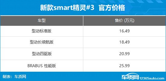 日前,smart品牌旗下紧凑型纯电轿跑SUV——新款smart精灵#3正式上市。新车共推出4款配置,售价区间为16.49-25.99万元,其中BRABUS性能版售价25.99万元。作为年度改款车型,新款精灵#3延续家族式设计语言,溜背轿跑造型搭配贯穿式灯组,运动感十足;BRABUS性能版新增通风口、导流槽及21英寸锻造轮圈,强化性能属性。