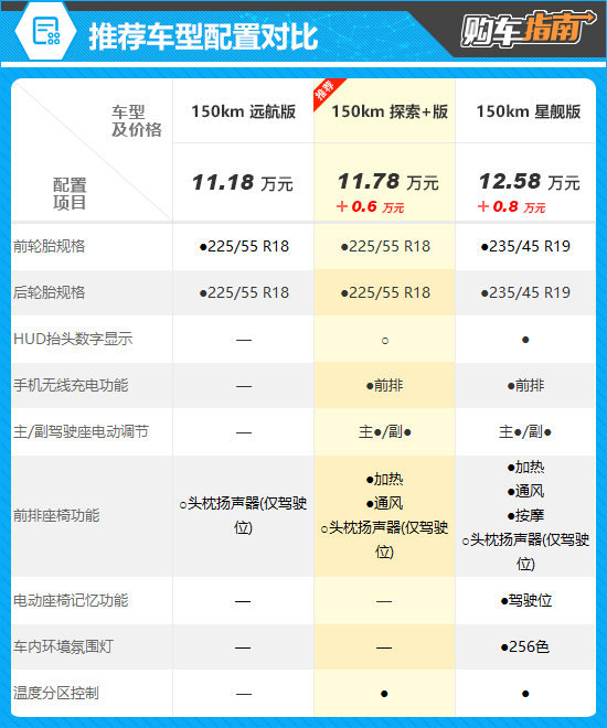 在吉利银河A7全系车型中,我们特别推荐售价为11.78万元的150km 探索+版。相比150km 远航版,推荐车型仅贵出0.6万元,却在前排座椅功能上提升明显,并增加了空调温度分区控制,可以带来更为舒适的乘车体验。同时,其还配备了手机无线充电功能,更符合时下消费者的手机充电习惯,还可根据自身需求进行其他功能的选配,展现出了十足的性价比优势。