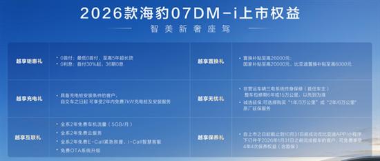 此外,购买新车还可享受2年内免费赠送7kW充电桩基安装服务、2年内免费车机流量、云服务、紧急救援等礼遇。特别强调一下,即日起至10月31日前成功在比亚迪APP/小程序下订并于2026年1月31日前完成提车的客户还可享受4年4次免费保养权益(含首保)。