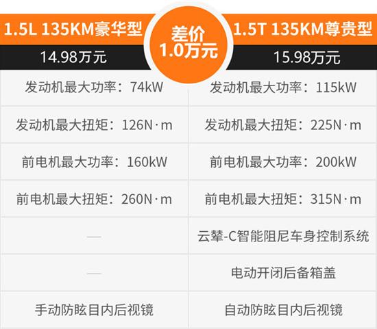 对于追求极致性价比的用户,我们强烈建议您选择性价比更高的1.5T 135KM尊贵型。除了增加电动后备箱、自动防炫目内后视镜等功能,动力系统和车身控制系统上的升级才是更应该着重考虑的因素,毕竟选择B+级别的轿车意味着您对驾乘品质和操控性能有更高的要求,把差价花在看不见但摸得着的地方,会越开越觉得值。