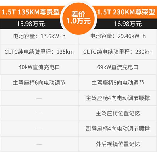 更大电池的有多香咱就不再赘述了,1.5T 230KM尊荣型还进一步提升了舒适便利功能上的表现,尤其是前排座椅功能的增加能够进一步提升主副驾乘员的乘坐舒适感,缓解长途行驶时带来的疲劳。对于更看重纯电续航里程和座椅功能的用户,这1万元的差价也同样值得投资。