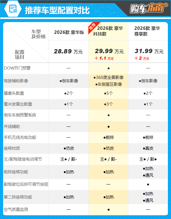 综合配置和价格因素考虑,豪华科技款更值得推荐。一方面,购买推荐车型可以享受官方限时超值补贴价21.89万元。另一方面,即便以原价购买,推荐车型也仅比入门车型贵了1.1万元,配置方面增加了DOW开门预警、倒车车侧预警系统、并线辅助、前排手机无线充电、空气质量监测等多项功能,并且将普通的倒车影像升级为360度全景影像,搭配车侧盲区影像,提供更安全的泊车体验,可谓是物有所值。