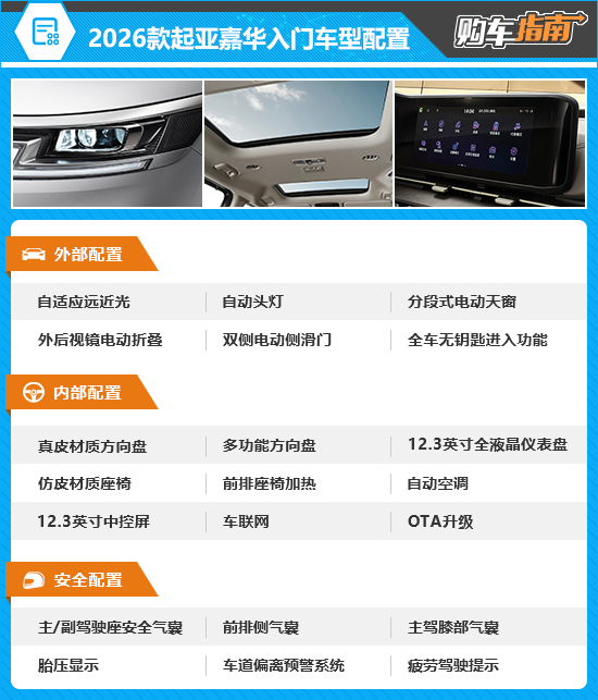 2026款起亚嘉华的入门车型为豪华版,售价28.89万元。从配置来看,入门车型在被动安全、灯光系统、车机功能以及空调等方面都有着不错的表现,提供了包括L2级辅助驾驶、双侧电动侧滑门、全车无钥匙进入、外后视镜电动折叠、自动空调在内的多项实用功能,完全可以满足日常使用需求。之所以不推荐入门车型,主要原因在于还有性价比更高的车型。