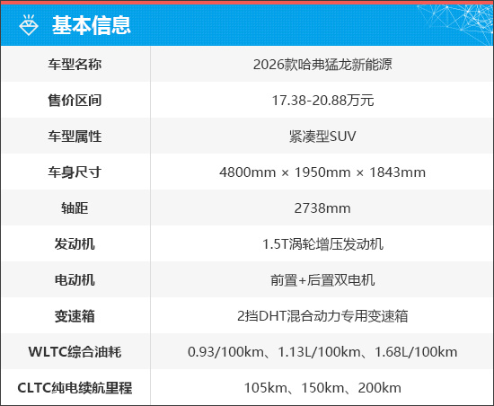 2026款哈弗猛龙新能源共推出6款车型,售价区间为17.38-20.88万元,限时优惠换新价区间为15.38-18.88万元。即日起至9月30日下定的用户,可享受10000元现金优惠和10000元置换补贴等购车权益(详情请咨询当地经销商)。