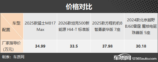 本次挑选的四款车型分别为2025款猛士M817 Max(以下称:猛士M817)、2026款坦克500新能源 Hi4-T 标准版(以下称:坦克500新能源)、2025款方程豹豹8 智勇豪华版 7座(以下称:方程豹豹8)和2024款北京越野BJ60雷霆 魔核电驱珠峰版 5座(以下称:北京越野BJ60雷霆)。在价格方面,四款车型均没有超过38万元,价格最低的北京越野BJ60雷霆只要30.18万元(由于目前图片数量较少,因此部分车型的图片并不是相对应的具体款型)。