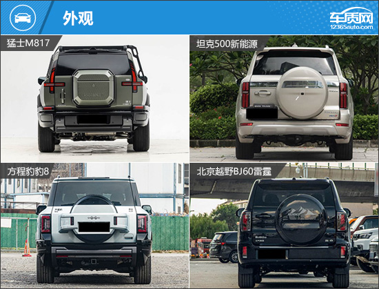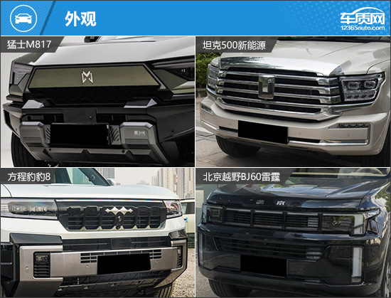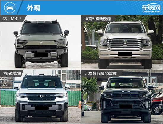 外观方面,四款车型均带有明显家族化元素,并通过硬朗的线条勾勒,打造出硬派SUV车型应有的硬汉形象。猛士M817前脸采用封闭式前格栅+发光饰条的搭配,更具科技感,也与当下新能源车型的流行风格相符合。两条凌厉的特征线艺术化地勾勒出醒狮鼻梁,两段式机罩如狮首昂立,进一步提升了威武感。坦克500前脸设计追求厚重感,横向镀铬装饰条增加了层次感和力量感。方程豹豹8整体造型方正,车头采用贯穿式LED日间行车灯,增强了整体感,并可以起到拉伸视觉宽度的作用。北京越野BJ60雷霆前脸配备标志性“五阙星环”格栅灯,精致感十足,下包围采用车身同色设计,为车辆增添了一丝都市气息。