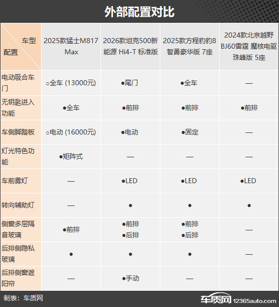 外部配置方面,坦克500新能源和方程豹豹8在伯仲之间,配置相比另外两款车型更完善,前者是四款车型中唯一配备手动后排侧窗遮阳帘的车型,后者的优势体现在标配全车电动吸合车门;同时,上述两款车型还标配电动车侧脚踏板、转向辅助灯等,日常用车体验较好。相比之下,北京越野BJ60雷霆配置水平略低,是四款车型中唯一不仅提供后排侧隐私玻璃和侧窗多层隔音玻璃的车型,会影响到日常的乘坐体验。