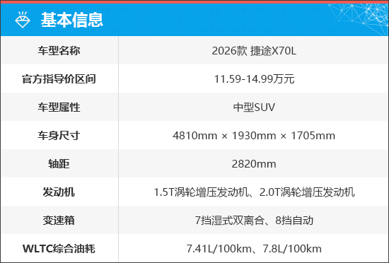 捷途X70L共推出5款配置车型,官方指导价区间11.59-14.99万元,除入门车型外,均可选装7座座椅布局。同时,官方还推出质保礼、置换礼等购车权益(详情请咨询当地经销商)。