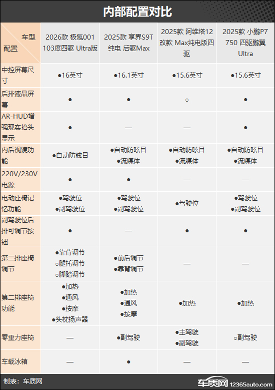 内部配置方面,极氪001与享界S9T的整体表现最为全面。但前者没有配备零重力座椅,略显可惜;而后者则成为四款车型中唯一未提供副驾驶位后排调节按键的车型,与其尊贵定位略有不符。阿维塔12在第二排座椅功能上略显保守,但作为唯一配备主驾驶零重力座椅的车型,其人性化考量颇具诚意。小鹏P7在显示系统上表现出色,后排液晶屏幕、AR-HUD增强现实抬头显示及流媒体内后视镜一应俱全。