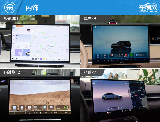内饰部分,四款车的中控台均采用了当下主流的简约风格与布局,仅极氪001和阿维塔12在中控屏下方保留了部分实体按键,其中极氪001也是四车中唯一采用电子挡把换挡的车型。细节方面,享界S9T的中控台设计更显厚重,凸显中大型车的尊贵气场;阿维塔12则采用远端屏布局,在不干扰驾驶视线的前提下,可更直观地呈现车辆信息;小鹏P7配备的三辐式方向盘造型独特,搭配左右卫星旋钮,令操作更加便捷高效。