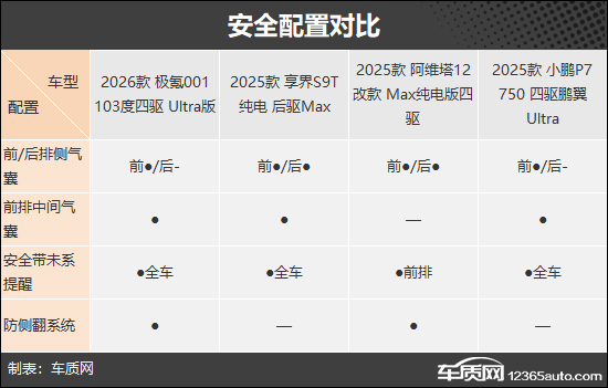 中大型车在安全配置方面普遍表现出色,这四款车型同样达到了较高水准,仅在细节上存在差异。其中,极氪001未配备后排侧气囊,享界S9T未搭载防侧翻系统,但两车整体安全防护依旧完善。小鹏P7集上述两项不足于一身,而阿维塔12则是唯一未配备前排中间气囊的车型,其安全带未系提醒功能也仅支持前排。