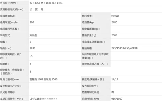 车身尺寸方面,新车长宽高为4763mm*1836mm*1471mm,轴距2830mm,与此前上市的超长续航版保持一致。整车整备质量2005kg,配备18英寸轮圈,轮胎规格为225/45 R18或255/40 R18,同时提供前保险杠、轮辋等多项选装配置。