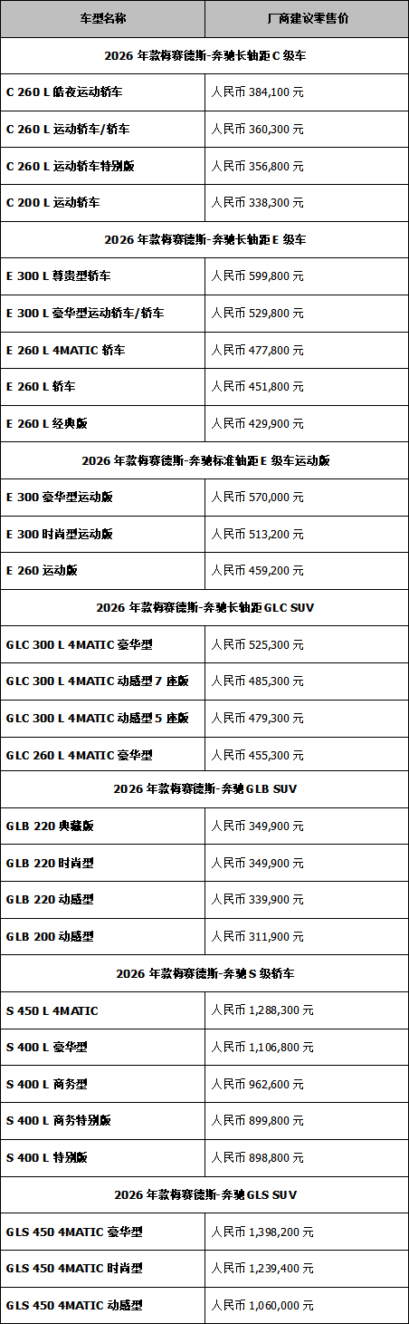 2025广州国际车展期间,梅赛德斯-奔驰多款核心车型升级上市。本次焕新阵容覆盖长轴距C级车、长轴距与标准轴距E级车、S级轿车,以及GLB SUV、长轴距GLC SUV与GLS SUV,多款车型引入经典版、特别版与典藏版,为客户带来更丰富的车型选择;更新增标配多项智能与舒适配置,以更强的产品力和更高的产品价值覆盖更多使用场景,满足中国用户对智能化与舒适体验的升级需求。