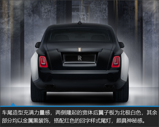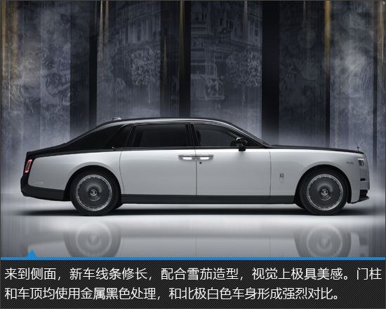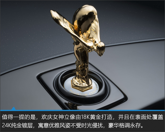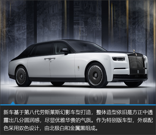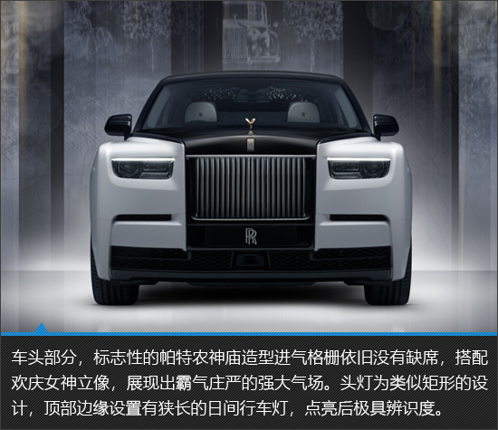 新车整体极具奢华格调,帕特农神庙格栅带来的压迫感是劳斯莱斯车型与生俱来的强大气场。北极白和金属黑的双色车身搭配纯金欢庆女神立像,进一步将豪华感推向全新的高度。