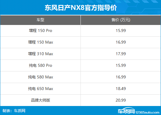 4月8日,东风日产NX8正式上市,此次共推出7款车型,其中包含一款NX8品牌大师版,售价15.99-20.99万元,限时权益价14.99-19.99万元。新车定位中大型SUV,并基于全新全栈自研的天演架构2.0打造,拥有800V高压平台、宁德时代5C超充等技术,动力上则提供增程和纯电两种动力形式。