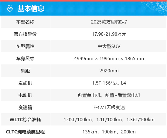 方程豹钛7共推出4款车型,官方指导价17.98-21.98万元。同时,官方还推出包括钛享升舱礼、钛享交付礼在内的多项购车权益(详情请咨询当地经销商)。