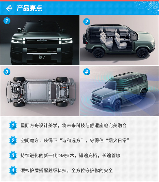 方程豹钛7全系搭载天神之眼辅助驾驶系统,可有效缓解长时间驾车的疲劳感。同时,整车采用“七横九纵”的高刚性车身结构,侧面门槛采用“六宫格”的铝型嵌入式结构,稳固可靠。此外,其最高支持140km/h爆胎刹停,在紧急情况下具备较强的安全保障能力。