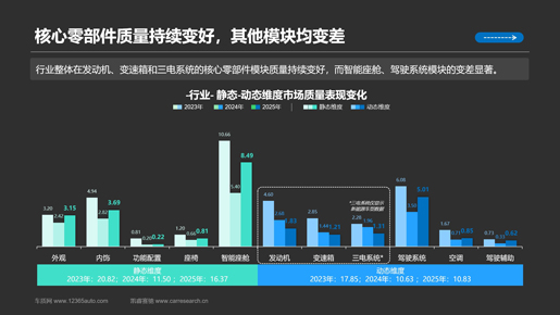 《2025年中国汽车产品质量表现研究(AQR)》研究发现,2025年行业整体质量水平出现下降趋势,问题数增长是导致下滑的主因。核心零部件模块质量持续改善,智能座舱和驾驶系统表现欠佳。研究首次引入“体验质量”概念并发现,用户体验层面问题显著增加。行业产品质量有所下降,问题数增幅明显,抱怨度变化不大。具体维度中,行业整体在发动机、变速箱和三电系统的核心零部件模块质量持续变好,而智能座舱、驾驶系统模块的变差显著。