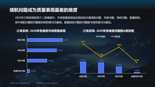 《2025年中国新能源汽车三电系统质量表现研究》发现,本年度新能源汽车三电系统质量表现整体呈现向好趋势,问题数显著减少,但用户抱怨度有所上升;自主品牌在整体质量表现上优于海外品牌,增程式车型在各动力类型中表现最佳。