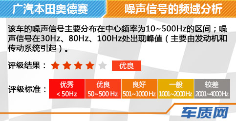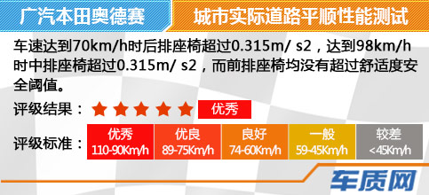 在噪音测试中,2015款广汽本田奥德赛在四种车速情况下,噪声声压平均值为±5Pa,且中心频率保持在10~500Hz区间。噪声信号大小均分布在60dB至70dB之间,可见车内降噪表现良好。在平顺性测试中,前排座椅椅面加速度均未超过舒适度安全阈值,这一表现值得肯定。但后排座椅加速度明显大于前排及中排,且在70km/h后率先超过舒适度安全阈值0.315m/s2,令乘客明显感到不舒适。综合此次实际道路及模拟越野路面平顺性能测试结果看,本期《数据说话》评定2015款广汽本田奥德赛的舒适性表现优良。阅读全文《2015款 广汽本田奥德赛 舒适性测试报告》