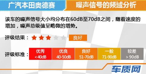 该车的噪声信号大小主要分布在60dB至70dB之间,并随着车速的增加噪声总级值略微增加,而后排噪声始终大于前排。由此可以判断,2015款广汽本田奥德赛在驾驶过程中对车内噪音控制良好。