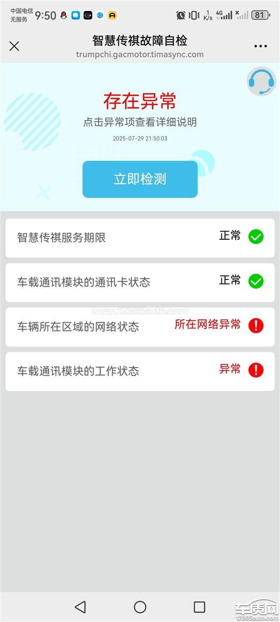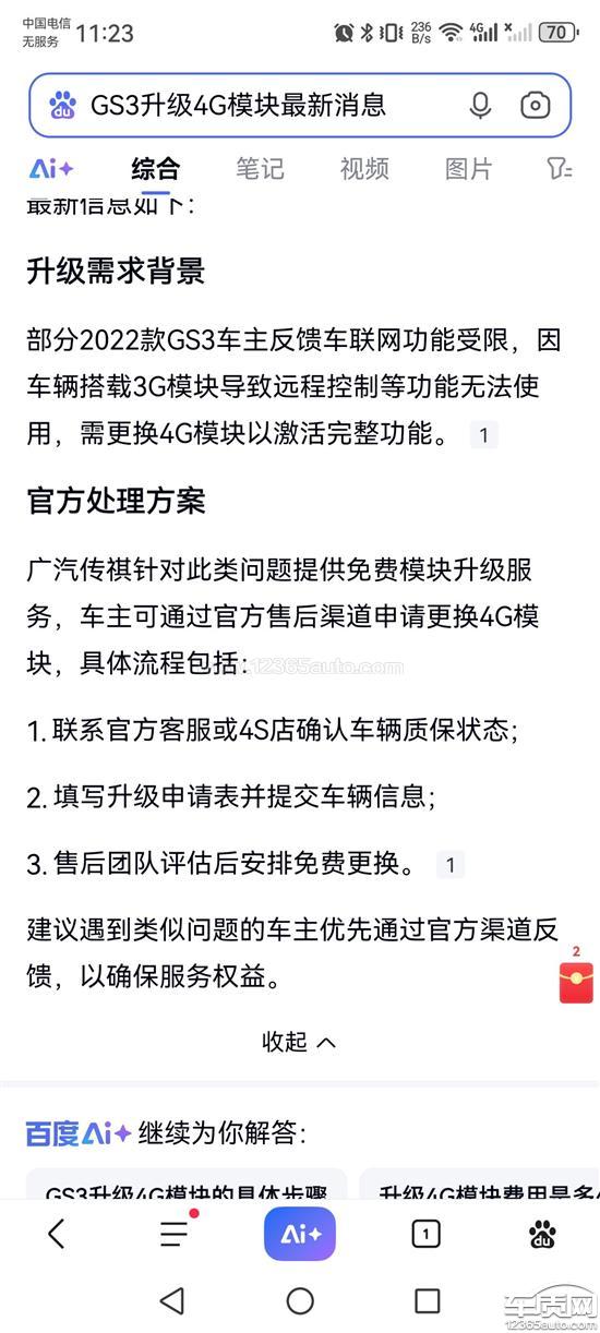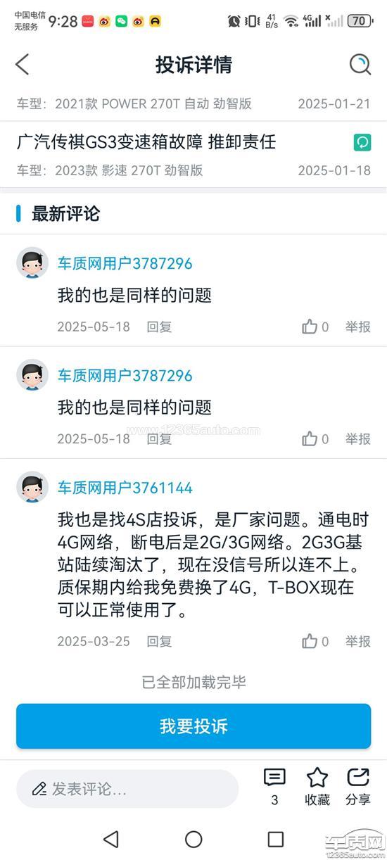 当初选这款车就是看上有手机远程控车功能,但24年开始车联网,手机远程控车开始失败,24年11月换了新的原版TBOX,因为原版是3G问题还是没有解决,24年到25期间也打过传祺400客服电话,也说过我这款车配的是3G模块,说暂时不能解决问题,今年25年相关资料了解到,有同款车主免费换了4G模块,问题得到了解决,这个7月去了买车那家4S店,4S店建议留车,留车将近2个星期,刷新软件跟新,回来后,手机控车还是不能成功,我希望厂家尽快安排升级版的4G模块安排更换,实现当初的承诺100年车联网基础包服务项目。